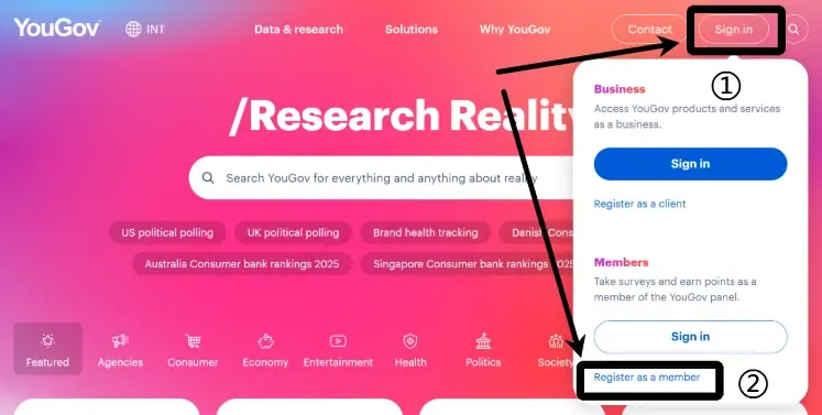 ① 打开 YouGov 官网(yougov.com),选择右上角“Sign in” →“Register as a member”
